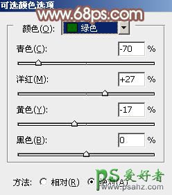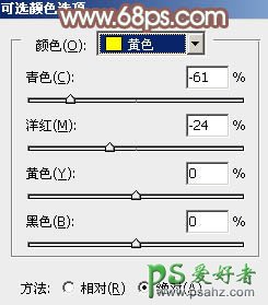 2、创建可选颜色调整图层,对黄、绿、黑进行调整,参数设置如图5 - 7,效果如图8。这一步把背景部分的绿色转为黄褐色。