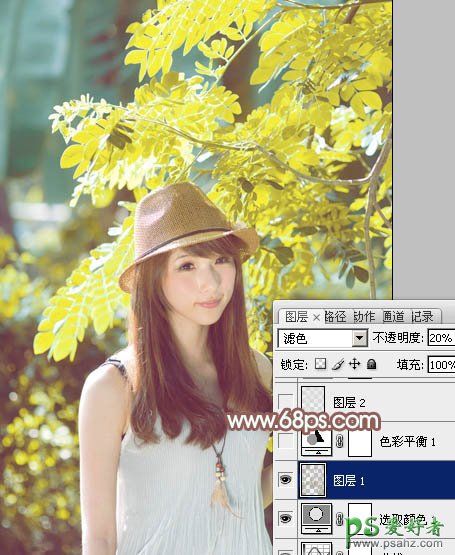 3、按Ctrl + Alt + 2 调出高光选区,按Ctrl + Shift + I 反选,新建一个图层填充黄褐色:#A2998A,混合模式改为“滤色”,不透明度改为:20%,效果如下图。这一步给图片暗部增加褐色。