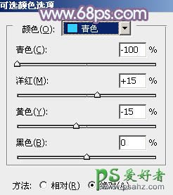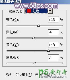 4、创建可选颜色调整图层,对红、青、白、黑进行调整,参数设置如图5 - 8,效果如图9。这一步把图片中的红色转为橙黄色,青色转为蓝色。