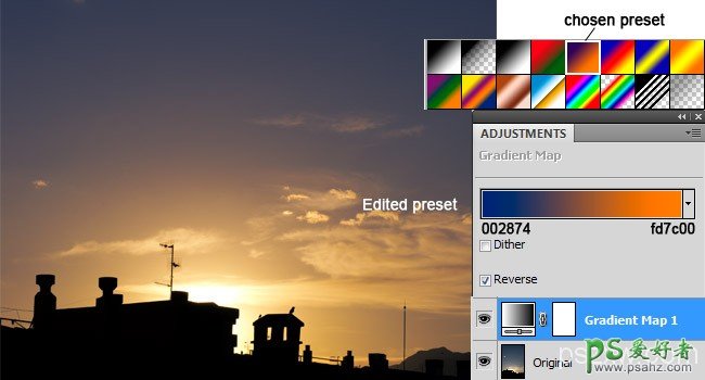 在图层面板上添加渐变映射后,你有决定颜色的渐变。的颜色取决于你的原始图像的颜色,而且还依赖于你想达到什么效果。在我的情况下,我喜欢天空的颜色,但我想要的是一个有点橙的光。