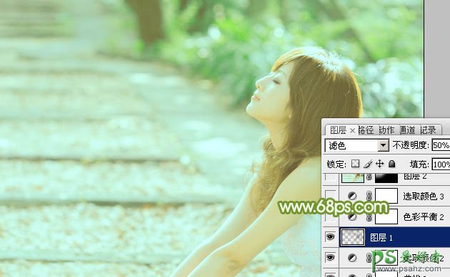 6、按Ctrl + Alt + 2 调出高光选区,按Ctrl + Shift + I 反选,新建一个图层填充暗绿色:#616652,混合模式改为“滤色”,不透明度改为:50%,效果如下图。这一步把图片颜色调柔和。