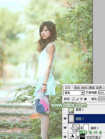 12、按Ctrl + Alt + 2 调出高光选区,按Ctrl + Shift + I 反选,新建一个图层填充暗绿色:#979D8F,混合模式改为“滤色”,不透明度改为:30%,效果如下图。这一步给图片暗部增加绿色。