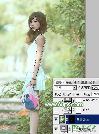7、把背景图层复制一层,按Ctrl + Shift + ] 置顶,按住Alt键添加图层蒙版,用白色画笔把人物脸部及手臂肤色部分擦出来,确定后把图层不透明度改为:60%,效果如下图。