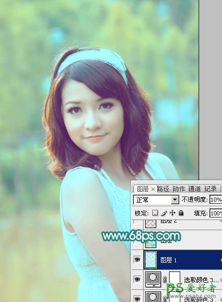 9、按Ctrl + Alt + 2 调出高光选区,新建一个图层填充淡青色:#AFF3FA,不透明度改为:10%,效果如下图。这一步给图片高光部分增加淡青色。