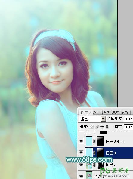 13、新建一个图层填充淡青色,混合模式改为“滤色”,按住Alt键添加图层蒙版,用白色画笔把左上角部分擦出来,给图片增加一点高光,效果如下图。