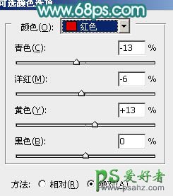5、创建可选颜色调整图层,对红,白进行调整,参数设置如图16,17,确定后把蒙版填充黑色,用白色画笔把人物脸部擦出来,效果如图18。这一步把人物脸部调红润。