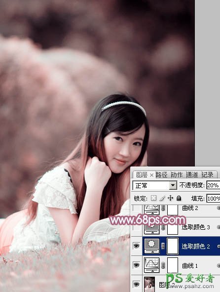 PS给绿草地上甜美的少女写真照调出小清新的粉红色效果