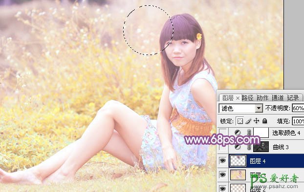 11、新建一个图层,混合模式改为“滤色”,不透明度改为:60%,把前景颜色设置为紫红色:#89477C,用画笔把下图选区部分涂上前景色。