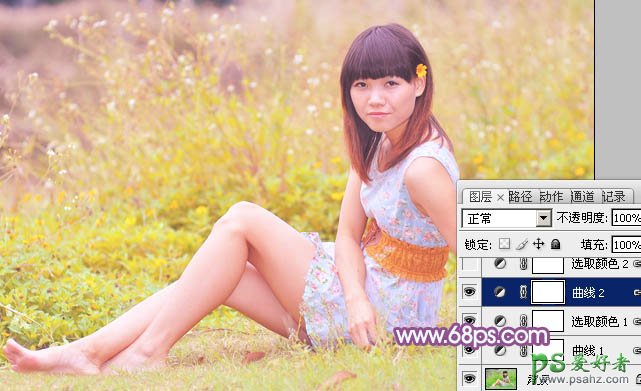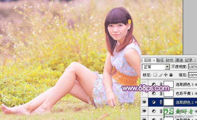 PS给绿草地上甜美的少女写真照调出小清新的粉红色效果