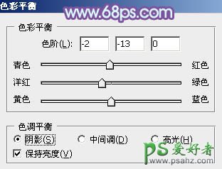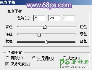 3、创建色彩平衡调整图层对阴影,中间调进行调整,参数设置如图8,9,效果如图10。这一步给图片增加蓝紫色。