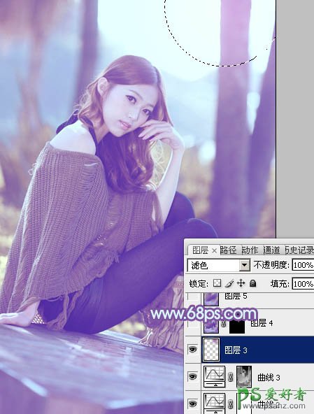 9、新建一个图层,用椭圆选框工具拉出下图所示的选区,羽化40个像素后填充暗紫色:#9C56A2,混合模式改为“滤色”,效果如下图。这一步给图片增加高光。