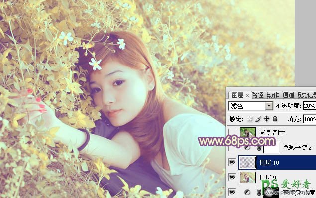 13、按Ctrl + Alt + 2 调出高光选区,按Ctrl + Shift + I 反选,新建一个图层填充暗蓝色:#735081,混合模式改为“滤色”,不透明度改为:20%,效果如下图。
