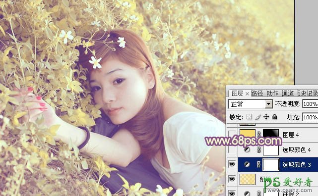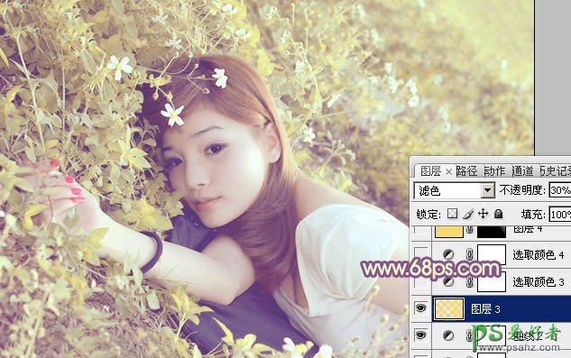8、按Ctrl + Alt + 2调出高光选区,新建一个图层填充橙黄色:#F5DB6F,混合模式改为“滤色”,不透明度改为:30%,效果如下图。这一步适当增加图片高光部分的亮度。