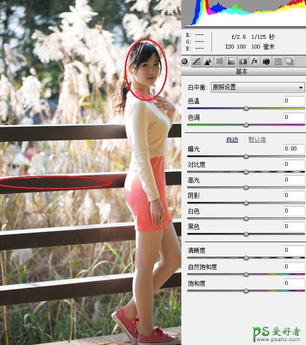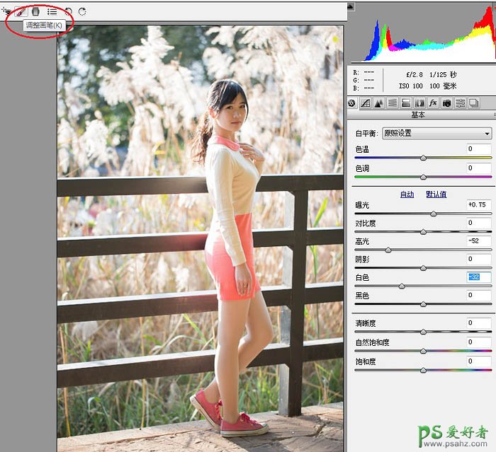 2、第一步就是在camera raw的基础面板里把曝光调准,可以看到曝光提升以后原片亮了不少,但是因为高光部分是正常曝光,提高以后高光反而爆了,所以将高光和白色都调节一下,达到合理的水平。对于面部和人物的曝光不足,需要用局部调整画笔来解决。