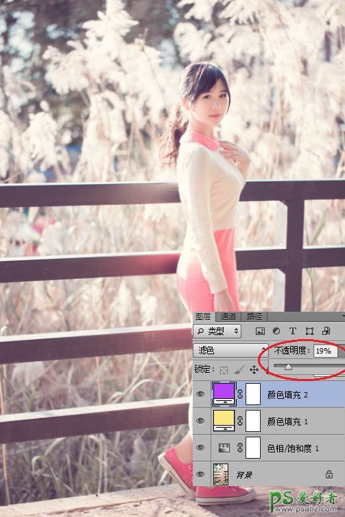 10、紫色也是我钟爱的颜色,所以再添加一个紫色图层,选择滤色模式,调节不透明度在19%。至此基本的色调就确定下来了,接下来就是细节的调整。
