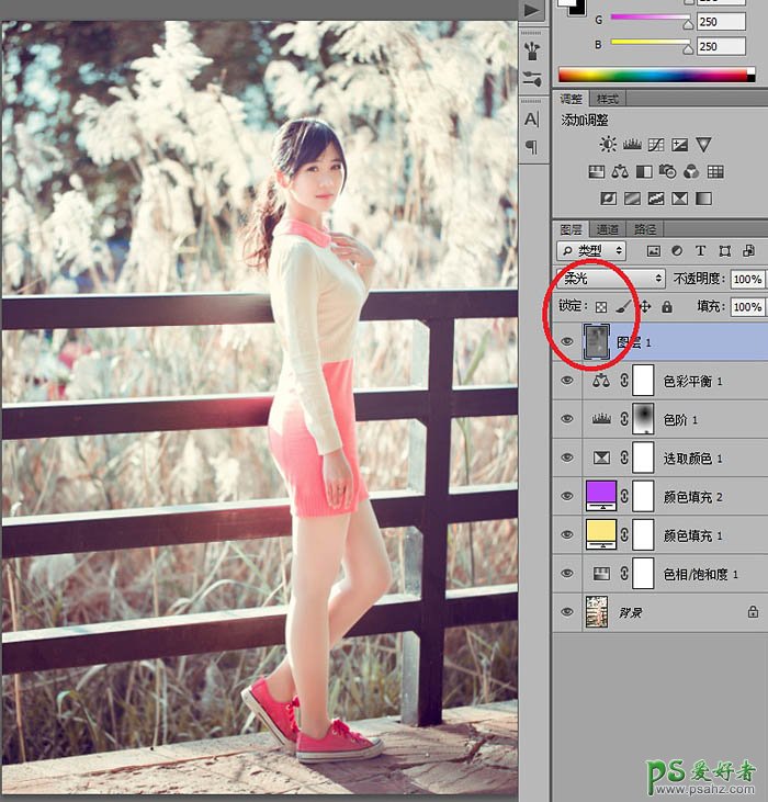 14、添加50%中灰层,选柔光模式,用15%不透明度的黑(白)笔刷调整画面光影效果,特别是人物面部做到明暗过渡平滑。你需要暗的地方你就多刷点黑色,反之亦然。