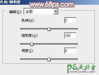 3、创建色相/饱和度调整图层,对全图进行调整,适当降低饱和度,参数及效果如下图。这一步得到偏中性色的图片。