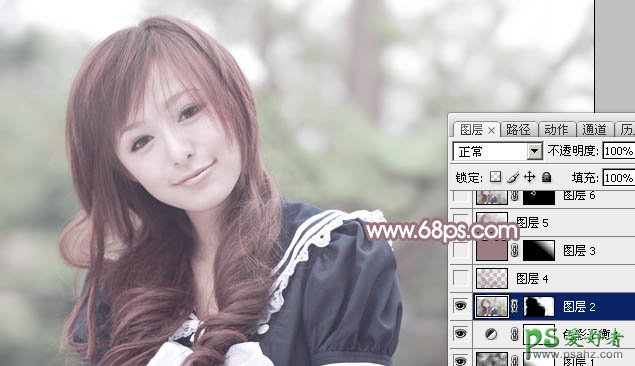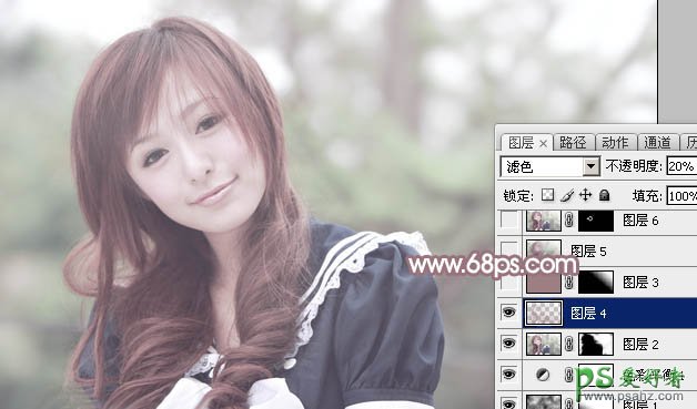9、按Ctrl + Alt + 2 调出高光选区,按Ctrl + Shift + I 反选,新建一个图层填充暗红色:#9C7E82,混合模式改为“滤色”,不透明度改为:20%,效果如下图。这一步把图片暗部颜色稍微调淡。