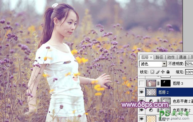 10、按Ctrl + Alt + 2 调出高光选区,按Ctrl + Shift + I 反选,新建一个图层填充暗紫色:#775E77,混合模式改为“滤色”,不透明度改为:50%,效果如下图。这一步适当增加图片暗部亮度。