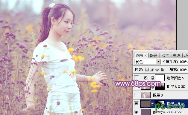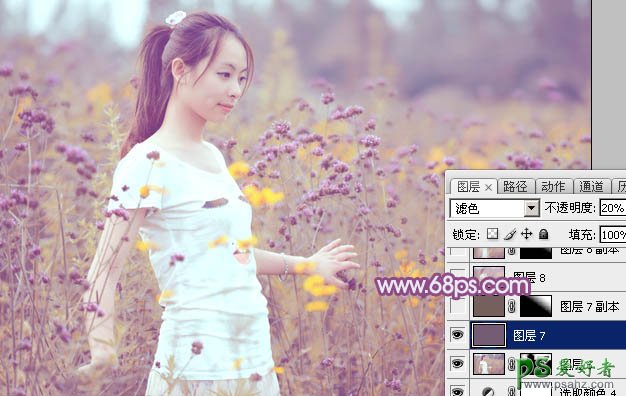 13、新建一个图层填充暗紫色:#755C75,混合模式改为“滤色”,不透明度改为:20%,效果如下图。这一步适当增加图片亮度。