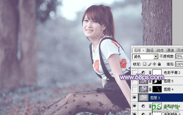 10、按Ctrl + Alt + 2 调出高光选区,按Ctrl + Shift + I 反选,新建一个图层填充暗红色:#736366,混合模式改为“滤色”,不透明度改为:25%,效果如下图。