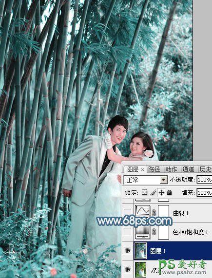 1、打开素材图片,按Ctrl + J 把背景图层复制一层,进入通道面板,选择绿色通道,按Ctrl + A 全选,按Ctrl + C 复制,选择蓝色通道,按Ctrl + V 粘贴。点RGB通道返回图层面板,效果如下图。这一步得到比较纯的青色图片。