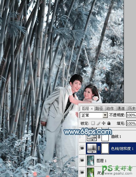 2、创建色相/饱和度调整图层,对青色进行调整,参数设置如图2,效果如图3。这一步把图片中的青色转为较淡的青蓝色。