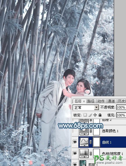 Ps婚片调色教程:给竹林中的婚纱写真照调出梦幻青蓝色