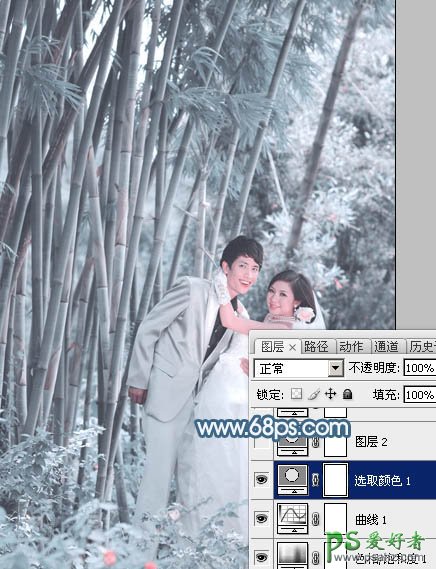 Ps婚片调色教程:给竹林中的婚纱写真照调出梦幻青蓝色