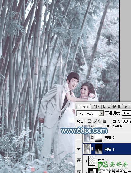 11、新建一个图层,按Ctrl + Alt + Shift + E 盖印图层,按Ctrl + Shift + U 去色,混合模式改为“正片叠底”,不透明度改为:30%。然后按住Alt键添加图层蒙版,用白色画笔把底部需要加深的部分擦出来,效果如下图。