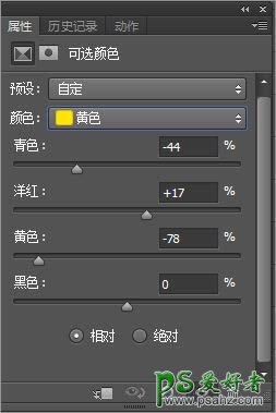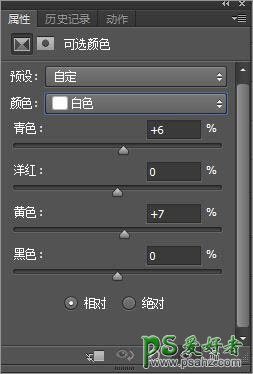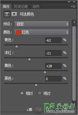 3、调整可选颜色:红色(-62、-21、28、0)、黄色(-44、17、-78、0)、白色(6、0、7、0)、中性色(0、0、-9、10)、黑色(8、0、-6、0)这里的数据只作为参考,实际操作时应根据需要调整。