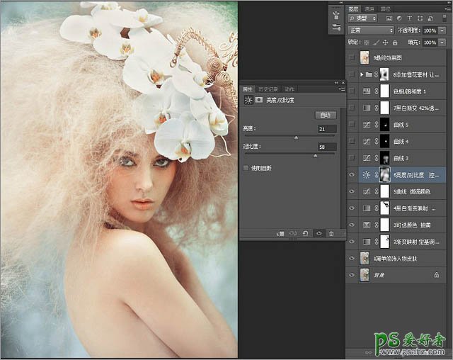 6、调整亮度/对比度,亮度21,对比度58,目的让画面更通透。
