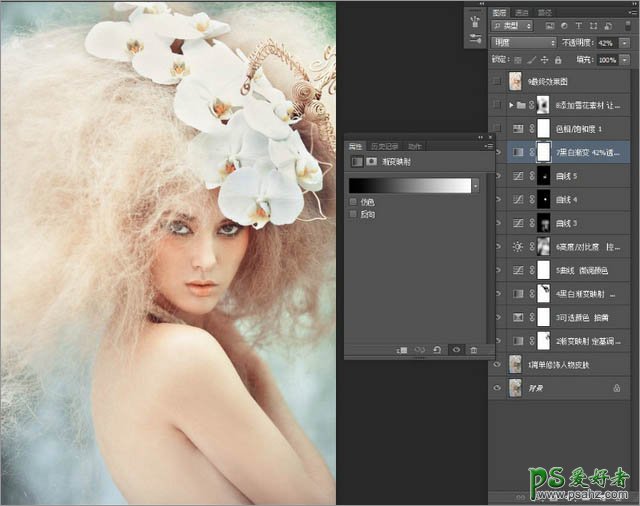 7、再次使用黑白渐变映射去灰作用,图层模式,明度42%不透明度。