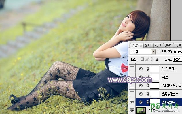 ps调色实例教程:给躺在树边的黑丝女自拍图调出淡黄色效果