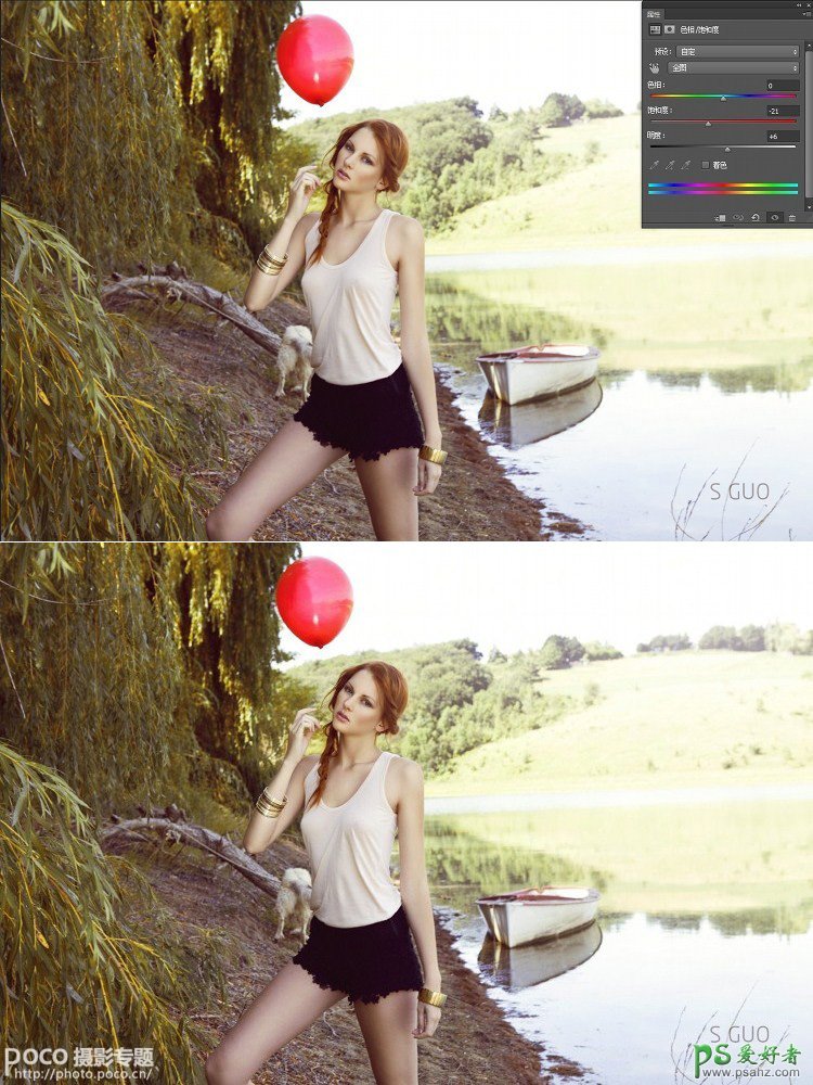 第六步:使用色相饱和工具对全图适当降饱和,让整体色调更统一协调。
