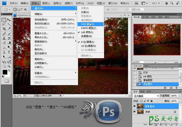 今天我们来学习一篇PS后期调色教程:给漂亮的秋景风光照片调出火红的色彩,风景照片调色,秋景照片后期调色实例教程,风光照片处理。 效果图 原图 一.首先鼠标双击工作区打开图片。 简单实用的风光调色法 二.点击“图像”——“模式”——转换图片为