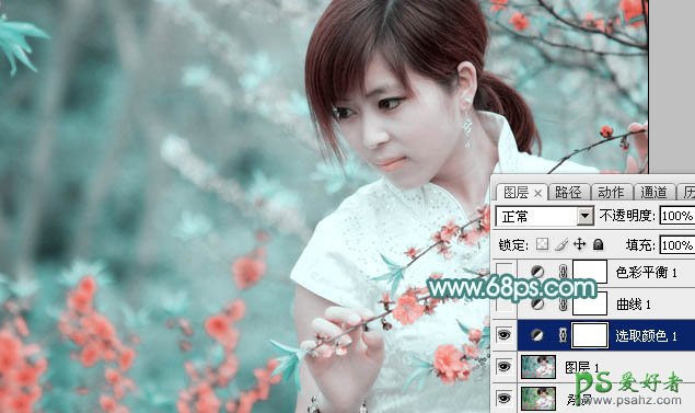 美女ps图片教程:给桃花中漂亮的妹妹艺术照调出古典淡蓝色
