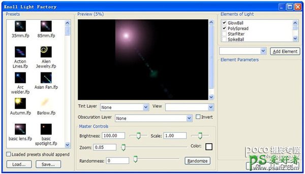 13、执行【滤镜】|【Digital Anarchy】|【Knoll Light Factory】命令,选择 85mm 的效果,参数如图。此步骤目的是为了做出光斑。