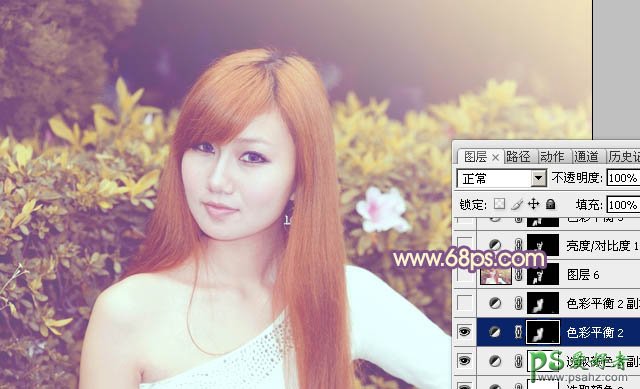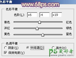 13、创建色彩平衡调整图层,对中间调进行调整,参数设置如图29,确定后把蒙版填充黑色,用白色画笔把人物脸部及肤色部分擦出来,效果如图30。这一步微调人物肤色。