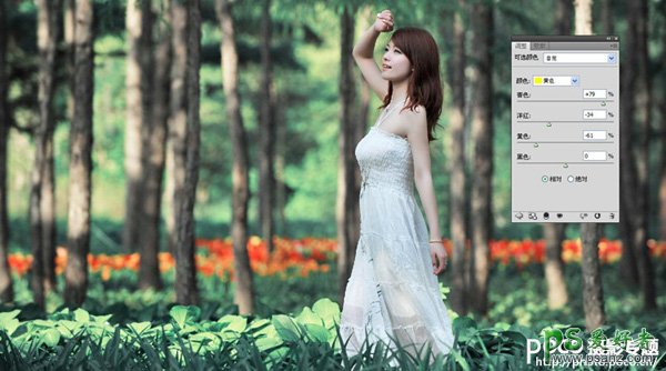 颜色——黄色,参数如下:青色:+79%、洋红:-34%,黄色:-61%,黑色:0%。