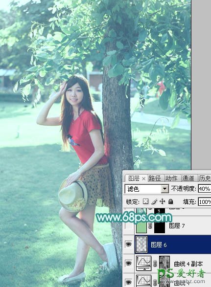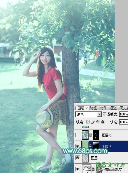 15、新建一个图层填充淡绿色:#96CE9B,混合模式改为“滤色”,按住Alt键添加图层蒙版,用白色画笔把左上角部分擦出来,效果如下图。