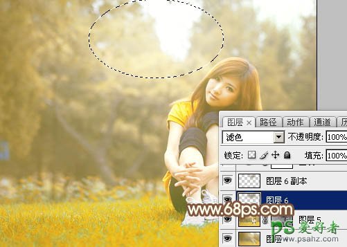 11、新建一个图层,用椭圆选框工具拉出下图所示的椭圆选区,羽化35个像素后填充黄褐色:#8A7D56,混合模式改为“滤色”,效果如下图。