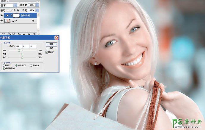 10、微调照片色调。单击【创建新的填充或调整图层】按钮,选择【色彩平衡】,移动青色和红色之间的滑块,使滑块偏向青色,即给照片再增添一些青色,操作完成。