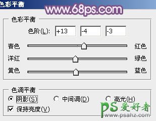 4、创建色彩平衡调整图层,对阴影、中间调、高光进行调整,参数设置如图10 - 12,效果如图13。这一步给图片暗部及高光部分增加蓝紫色。