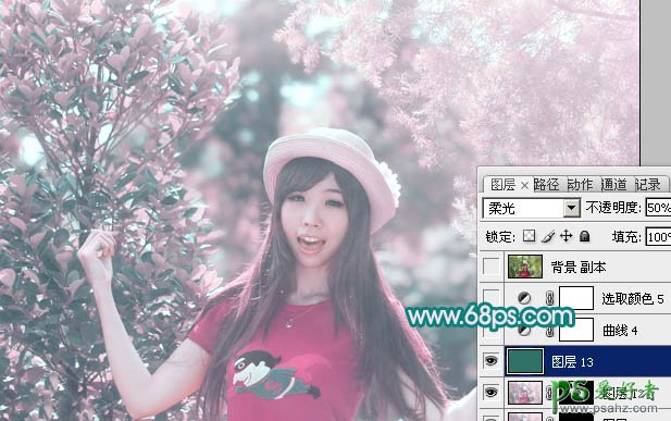 13、新建一个图层,填充暗绿色:#2E7268,混合模式改为“柔光”,不透明度改为:50%,效果如下图。