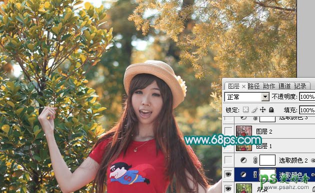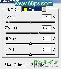 2、创建可选颜色调整图层,对黄,绿进行调整,参数设置如图3,4,效果如图5。这一步同样给图片增加暖色。