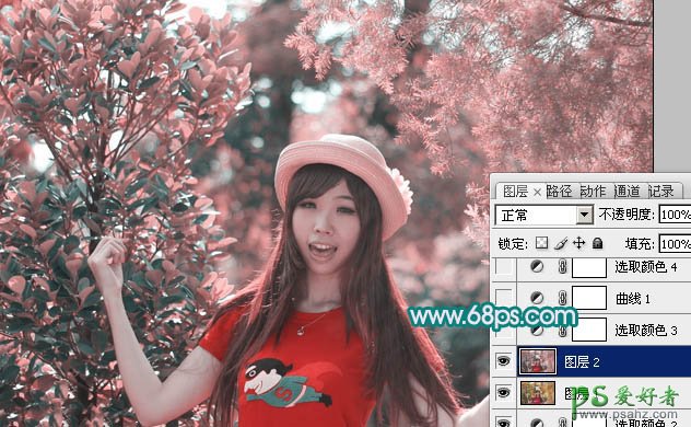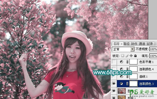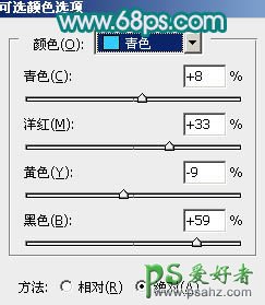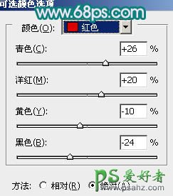 4、创建可选颜色调整图层,对红,青进行调整,参数设置如图7,8,效果如图9。这一步主要把红色转为紫红色。