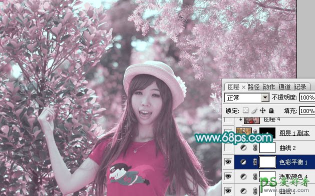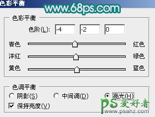 7、创建色彩平衡调整图层,对高光进行调整,参数及效果如下图。这一步给高光部分增加淡紫色。