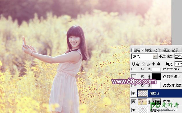 12、按Ctrl + Alt + 2 调出高光选区,按Ctrl + Shift + I 反选,新建一个图层填充暗紫色:#885572,混合模式改为“滤色”,不透明度改为:25%,效果如下图。