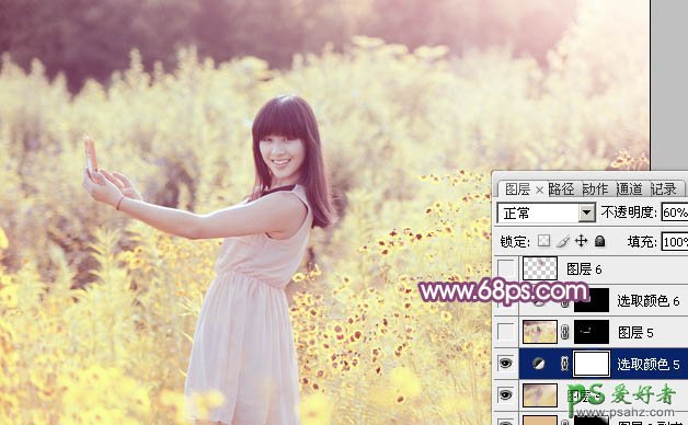 10、创建可选颜色调整图层,对红、黄、白进行调整,参数设置如图30 - 32,确定后把图层不透明度改为:60%,效果如图33。这一步给图片增加淡黄色。